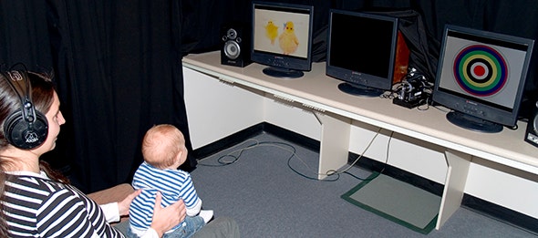 At this point, the name of the object would switch to another word that differed only in its vowel, or the word would stay the same. If a switch did occur and children noticed the word (and therefore the vowel) was different, they would become interested again and resume looking at the screen. But if children could not tell that the word was different, they would continue to be bored and not look at the screen, and this would mean they could not tell the difference between the two vowels.