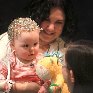 During the session, baby's brain waves will be measured and recorded using an advanced EEG system which involves putting a smooth net of sensors on the baby's head. This system is certified for use with babies and it's completely painless. The study will last around 20 minutes.