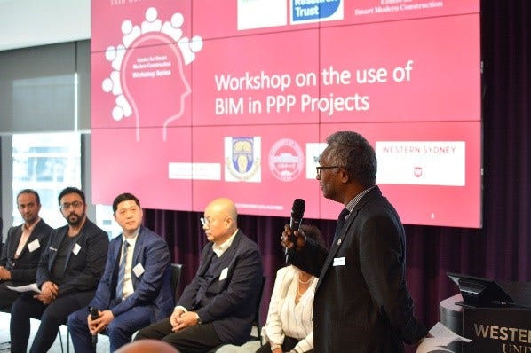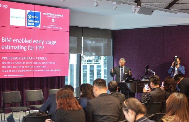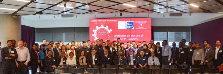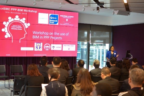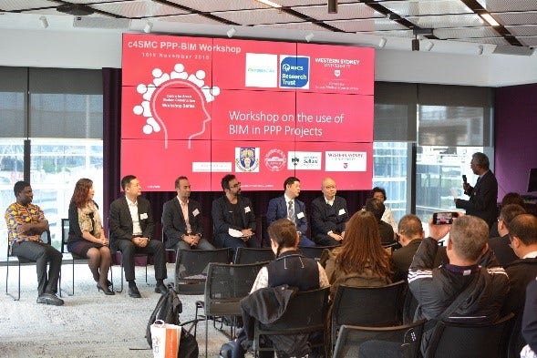 An industry workshop was organised by the Centre for Smart Modern Construction (c4SMC) on 16, November 2018 at Parramatta City Campus, Western Sydney University. The workshop titled “Use of Building Information Modelling (BIM) in Public Private Partnership (PPP) projects” was organised as part of the Royal Institution of Chartered Surveyors (RICS) Research Trust funded research project. It aimed at understanding the practice of BIM in Australia, UK, and China with respect to estimating in PPP projects. The purpose of the workshop was to bring academic and industry experts together to discuss and share ideas on how BIM can be effectively used in PPP projects and to disseminate the findings of the research project. International industry practitioners from China, Sri Lanka, Malaysia, UK and Australia participated in the workshop while providing a platform for networking with the people who have real time exposure to the use of BIM in PPP projects. The workshop attracted over 80 delegates and concluded successfully with deliberations on future research collaborations. Among the activities of the day included a demonstration of the use of BIM and a panel discussion on drivers and barriers for use of BIM in different countries.