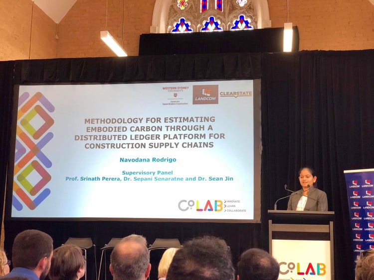 Navodana Rodrigo presented her doctoral research study titled, “Methodology for estimating embodied carbon through a blockchain platform for construction supply chains” at the annual Co.Lab Conference organised by Landcom and UrbanGrowth NSW Development Corporation on 22nd November 2018 at Parramatta North Heritage Core, Parramatta. The Co.Lab 2018 is themed on the basis of collaborative research and learning partnerships. While Navodana represented Western Sydney University by presenting her study, several other universities such as University of Newcastle, University of Technology Sydney, University of Sydney, University of NSW, Macquarie University, Southern Cross University and University of Wollongong participated in this event.