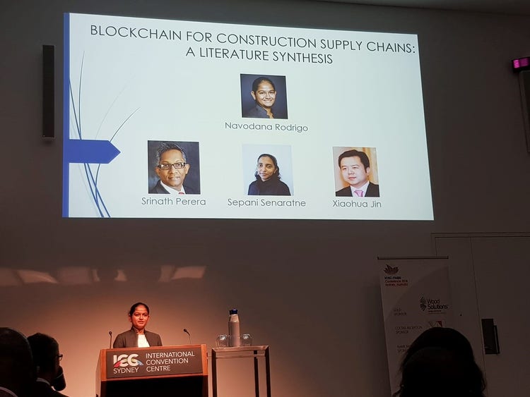 Navodana Rodrigo along with the supervisory panel comprising of Prof. Srinath Perera, Dr. Sepani Senaratne and Dr. Xiaohua Jin published a research paper titled “Blockchain for Construction Supply Chains: A Literature Synthesis” at the annual ICEC PAQS Conference on 19th November 2018 in Sydney. The ICEC PAQS Conference is a world renowned peer-reviewed annual conference where a majority of local and international construction managers and quantity surveyors participate to demonstrate their research work. It was indeed a fruitful platform to present the research paper and receive feedback from such an expert audience consisting of intelligent and experienced industry practitioners.