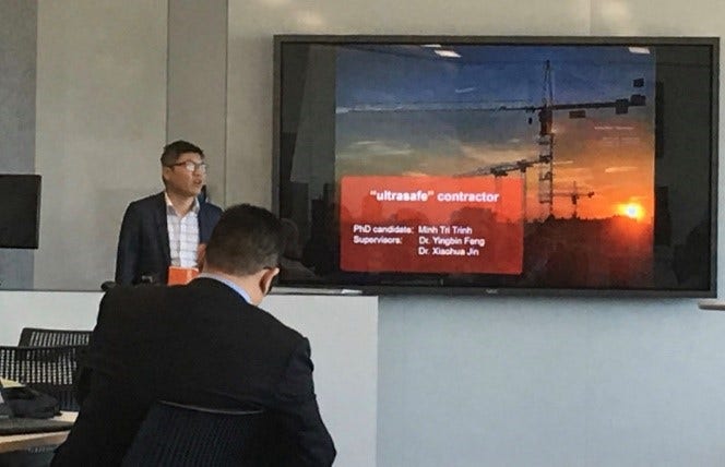 PhD candidate Minh Tri Trinh also presented his work. He is supervised by Dr. Yingbin Feng and Dr. Xiaohua Jin. Tri’s research is investigating the relationship of factors that contribute to developing an ultra-safety culture in the construction industry. His objective is to provide insights into How to Become Ultra-safe Regardless of the Changing Complexity Levels of Construction Projects. PhD candidate Anthony Butera supervised by Professor Vivian Tam and Dr Le presented his research on Carbon-conditioned recycled aggregate in concrete production.