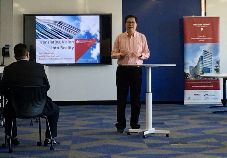 Prof. Albert Chan, Chair Professor and Head, Building and Real Estate at Hong Kong Polytechnic University. Professor Chan was the guest of the Centre for Smart Modern Construction’s academic colloquium held at University’s Parramatta Campus in August. Albert’s visit was part of an Australian construction industry goodwill tour where he shared with us his department's research, job opportunities in HKPolyU for PhD graduates and potential research collaborations in Hong Kong. He also took the opportunity to talk about the CIB World Congress 2019 (opens in a new window) which will be hosted at the Hong Kong Polytechnic University.