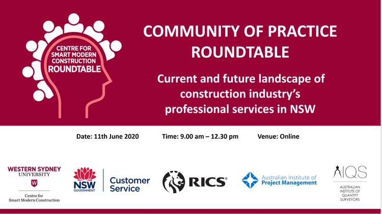 The Community of Practice Roundtable which was held on 11th June 2020 as a virtual event, was organised by the Centre for Smart Modern Construction (c4SMC) at Western Sydney University on behalf of the Office of NSW Building Commissioner (OBC), together with representatives from Australian Institute of Quantity Surveyors (AIQS), the Royal Institute of Chartered Surveyors (RICS), and Australian Institute of Project Managers (AIPM).