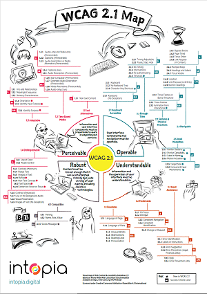 Take a look at this visual mapping of the WCAG 2.1 guidelines (opens in a new window) created by Australian digital inclusion company, Intopia. Not only is this a great visualisation of the current accessibility standards, Intopia's blog article is a great example of accessibility in action with its multi-format options for accessing the map content.