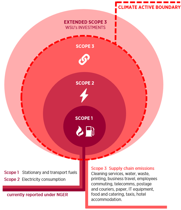 The organisational carbon footprint was estimated in relation to the Climate Active (opens in a new window) boundary in the image below.