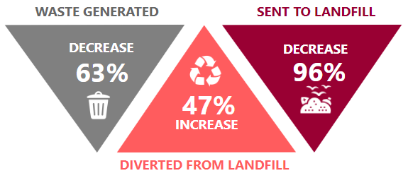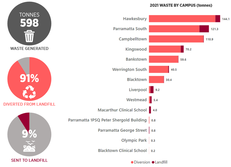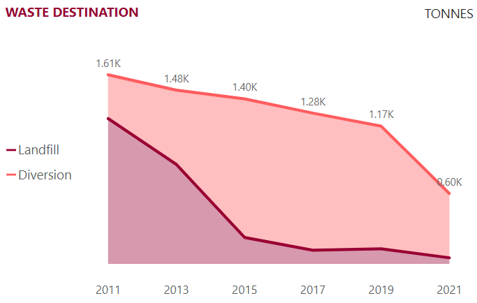 The COVID-19 pandemic created anomalies across all our campuses in 2020 and continued into 2021, with closures and decreased usage resulting in reduced waste. Whilst the past two years' trends may not provide a true reflection on our waste habits, they are reviewed as lessons learned.