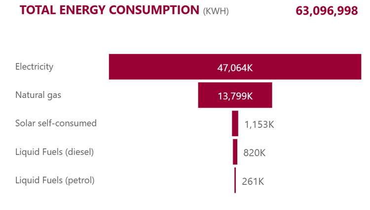 A total of 63,096,998 KWH of energy (under Scopes 1 and 2) was consumed across all campuses comprising:
