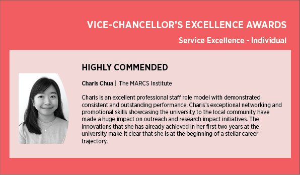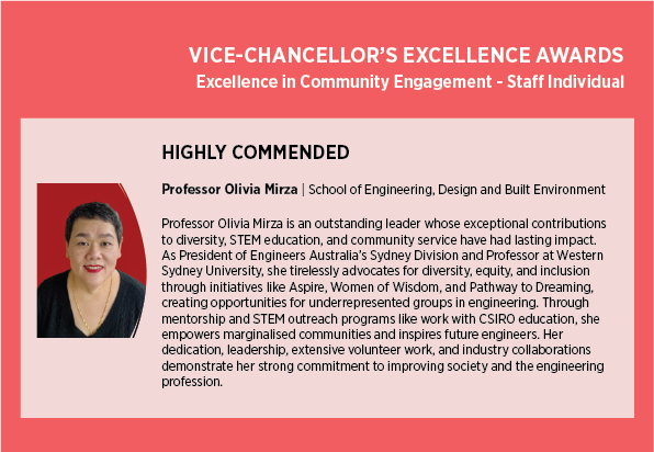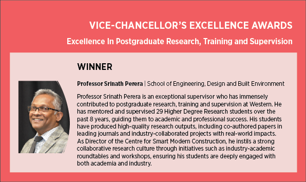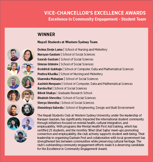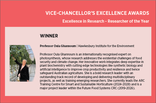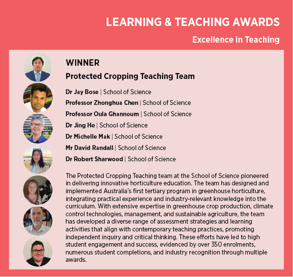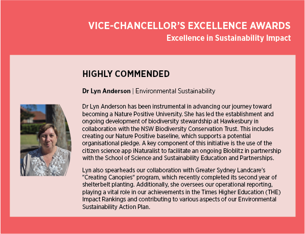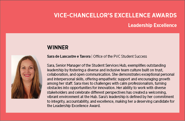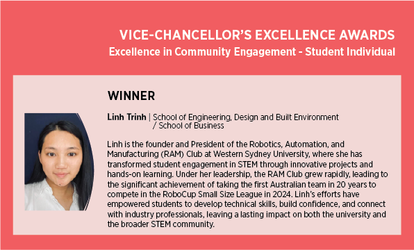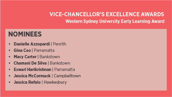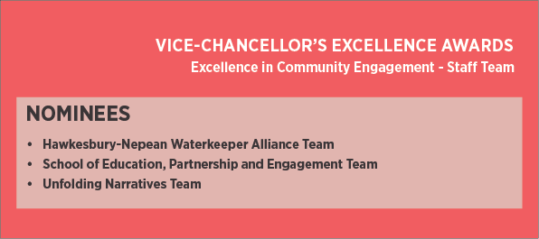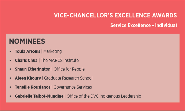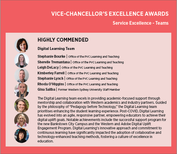 The 2024 Excellence Awards took place on Thursday, 12th December, at the Ian and Nancy Turbott Auditorium on the Parramatta South Campus. The event celebrated outstanding achievements across three key categories: the Vice-Chancellor's Excellence Awards, the Senior Deputy Vice-Chancellor Research Enterprise and Global Research Awards, and the Deputy Vice-Chancellor Education Learning and Teaching Awards. Below is the complete list of nominees and award recipients.