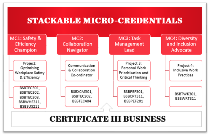 - Stack these micro-credentials to qualify for the BSB30120 Certificate III in Business.