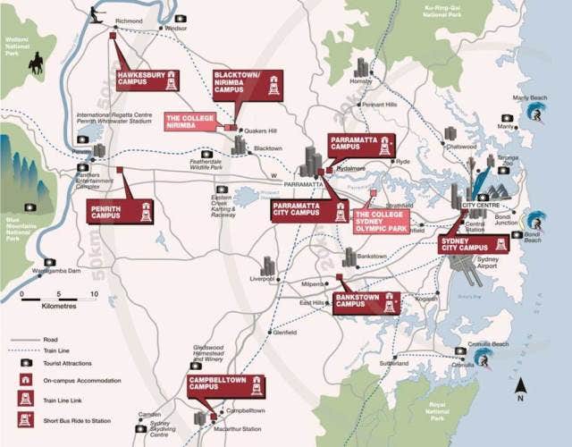 Penrith campus is located on the bushland western edge of the Sydney metropolitan area, at the foot of the Blue Mountains near the Nepean River. The 158-hectare vibrant campus has two sites in the suburbs of Kingswood and Werrington, located about 75 minutes by train from Sydney's downtown.