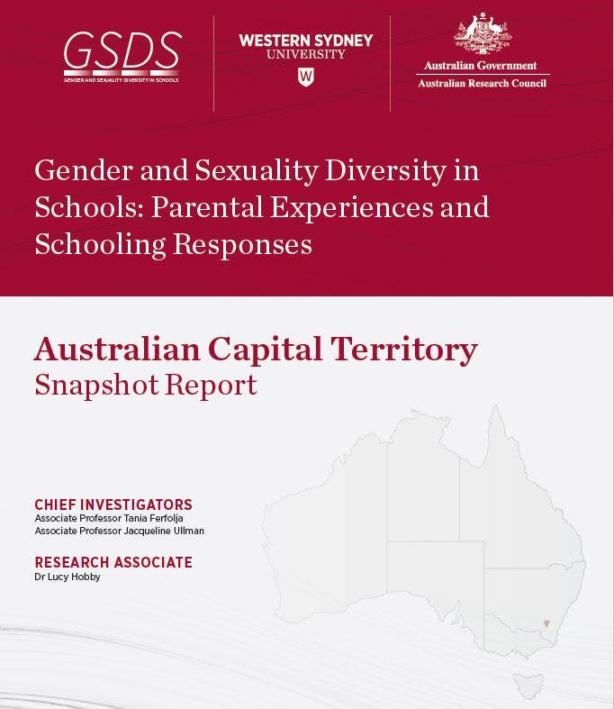 Ferfolja, T., Ullman, J., & Hobby, L. (2021). Gender and Sexuality Diversity in Schools: Parental Experiences and Schooling Responses - Australian Capital Territory Snapshot Report. Penrith, Australia: Western Sydney University.