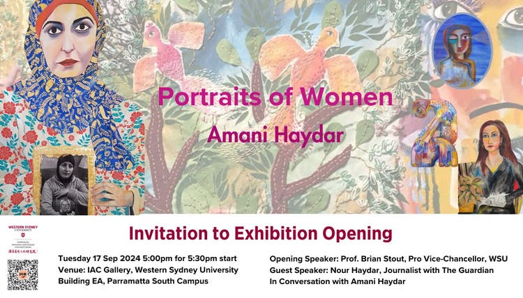 This uniquely empowering exhibition titled Portraits of Women, featuring the Western Sydney-based artist Amani Haydar who is also an award-winning writer, advocate for women’s health and safety and a former lawyer. Amani was born and grew up in Western Sydney of Lebanese heritage. Her parents migrated from Lebanon. In 2015 her father killed her mother as a result of brutal domestic violence, when Amani was five months pregnant with her first child and working as a lawyer. Her self-portrait holding her mum who is holding grandma who was killed in Lebanon won the Archibald finalist in 2018. In 2021 she published a memoir "Mother Wound" which won many awards including Victoria Premier’s Literary Award for Non-Fiction. This exhibition showcases Amani’s portraits of women, telling stories of women – all women, inspiring resilience, strength, hope and beauty, under and despite devastating traumas. She has developed a very distinctive artistic style and her artworks are strikingly beautiful to watch.