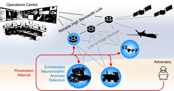 In this project, you will first survey the current state of the art anomaly detection systems in the Neuromorphic and Machine Learning fields. Building on these solutions, you will design and test novel low-power high speed spiking neural network architectures which can build internal models of normal edge device behaviour with respect to sensory and network input and detect anomalous behaviour against this background model. As shown in Figure 1, by only transmitting anomalies and through learning to respond locally to anomalies, the system could dramatically reduce the burden on the available communication channels and human operators while rapidly dealing with normal signal traffic at the edge. After simulation on a conventional processor, your developed architecture must be implemented in FPGA hardware and be put to the test on real-world autonomous platforms in live trials against expert hackers.