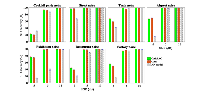 Comparing all results in FIG. SuppPub2, we see that the CARFAC provides significantly improve performance at 5 dB compared to -5 dB SNR which is consistent with FIG. 15 and 16 (in main file). Below that threshold, the performance of the CARFAC reduces significantly, but, still mostly outperforms the CAR and the AN algorithm. Thus, the FAC and instantaneous nonlinearity sections of CARFAC are important for boosting performance when the SNR is low as shown in FIG. 2S.