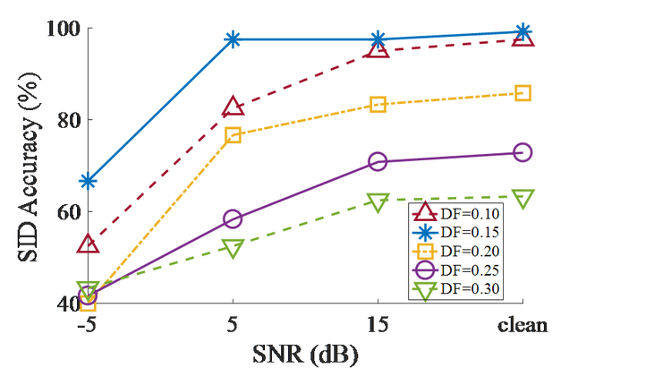 FIG. SuppPub1A shows that, as h reduces, the peak response of the BM filter becomes increasingly asymmetric. This asymmetry reduces overlap among filter responses at their high-frequency slopes. Thus, a lower value of h produces less correlated output from the BM, which improves SID performance. We chose h =0.35*c0, i.e., the pole-zero distance is less than a semi-octave. FIG. SuppPub1B shows the effect of the damping factor on SID accuracy for the CARFAC method for four SNR values. The damping factor controls the BM response compression. In human hearing research, typical values of the damping factor range from 0.1 to 0.4 (Lyon, 2017). We set the damping factor to 0.15, which achieves the best SID accuracy as shown in FIG. 1BS.