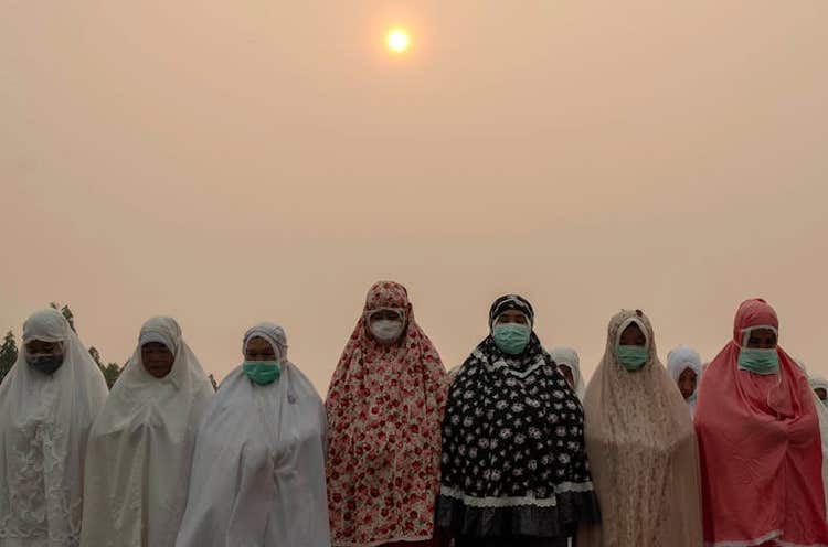 Indonesian women wear protective masks as they perform a mass prayer for rain to combat the smoke haze and drought season in Indonesia. AFRIANTO SILALAHI
