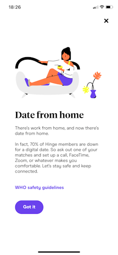 Dating apps continue to serve public service announcements in-app, as well as encouraging people to use their chat and video functionalities to continue exploring potential relationships.