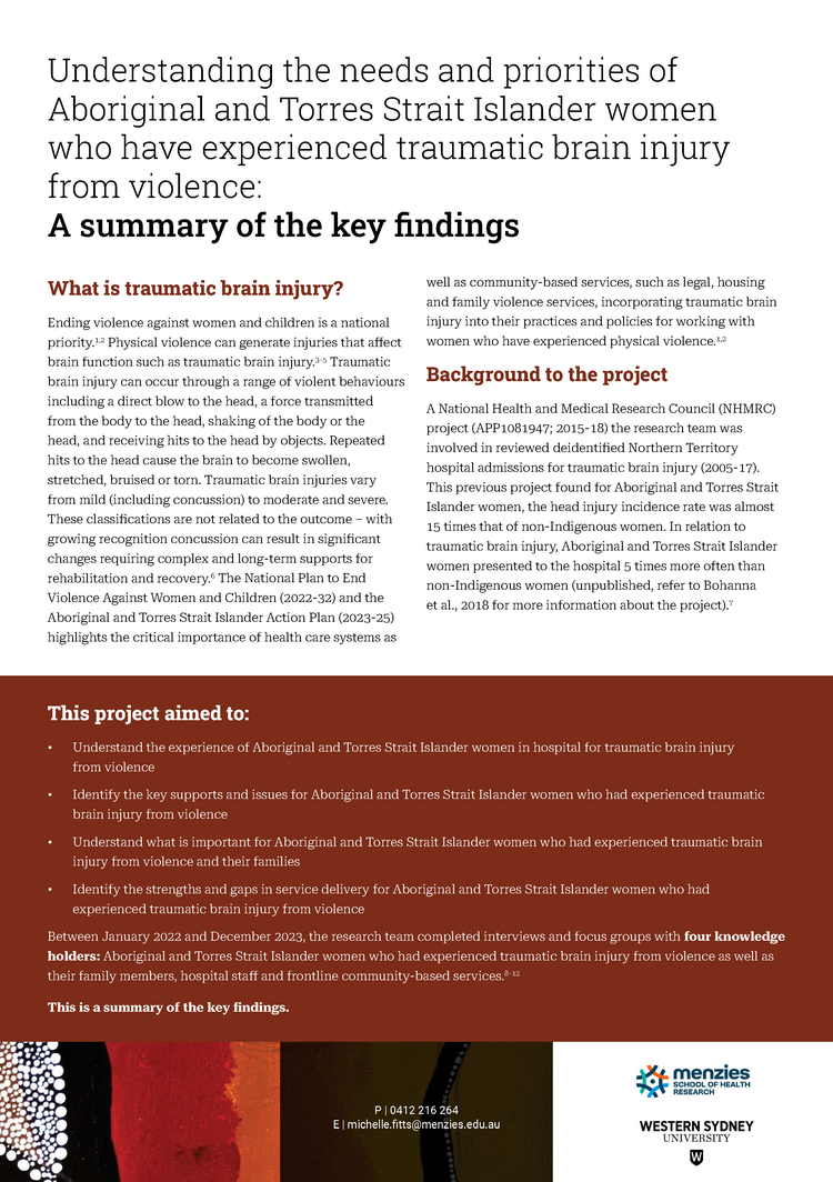 Wills, E, & Fitts, M.S. (2024). Listening to the voices of Aboriginal and Torres Strait Islander women in regional and remote Australia about traumatic brain injury from family violence: A qualitative study. Health Expectations.