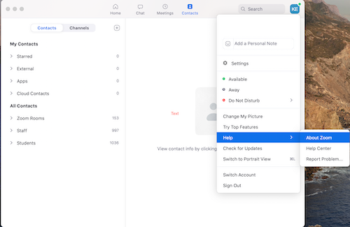 Within the Zoom client/app, select your profile icon on the top right of the screen (usually with your initials on the icon).