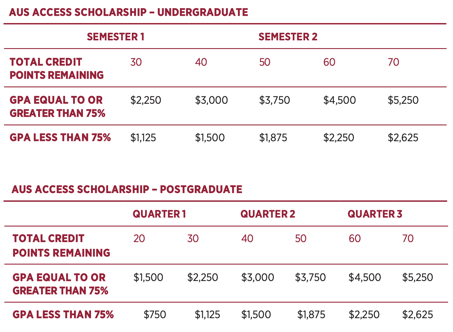 The AUS Access Scholarship is for students enrolling in 70 credit points or less, in eligible Western Sydney University undergraduate or postgraduate courses in Australia. Students will be eligible to apply for the AUS Access scholarship which will be awarded at the rates outlined in the table below which outlines the maximum scholarship amounts: