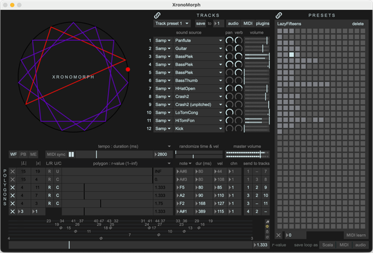 (Right) The XronoMorph musical loop generator, developed by Milne (https://www.dynamictonality.com/xronomorph.htm)