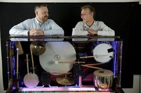 (Right) The Rhythmotron – a robot drum machine in a piano. Developed by Milne (right), Taylor (left), and Stanton at MARCS, and exhibited at several on-street arts events in Sydney (2017–2019).