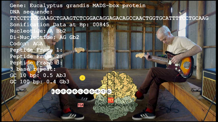 (Left) Mark Temple playing guitar to a sonification of the Eucalyptus genome.