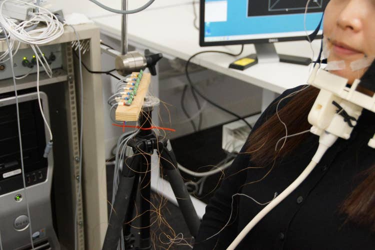 This system generates a defined yet safe electro-magnetic field surrounding the participant’s head/shoulders, allowing the fine-grained temporal and 3-dimensional tracking of multiple wired micro-sensors that can be temporarily attached to the face, lips, gums and locations along the tongue. It is used to track tongue, lip and jaw gestures and their temporal and spatial coordination during speaking.