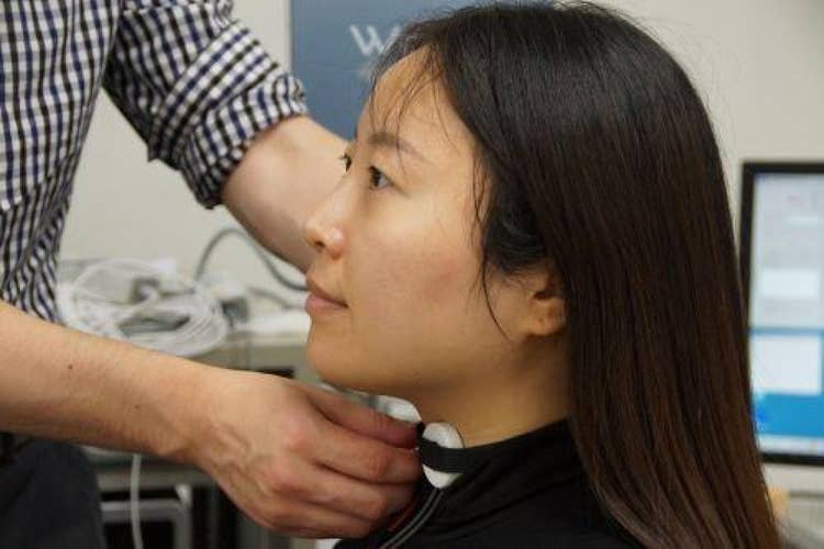 Two disk-shaped sensor pads are affixed by a wide elastic band to the ides of the neck, positioned on either side of the larynx to pick up and record the waveform and frequency of voice pulses from the larynx during speaking or singing.