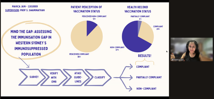 Overall Winner, Mahica Jain, Year 4, 2025 student presented her MD Project research topic " Mind the Gap: Assessing the Immunisation Gap in Western Sydney's Immunosuppressed Population".