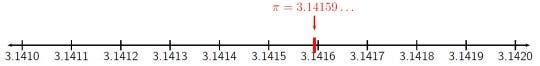 π rounded to 4 decimal places is 3.1416 (3.14159… is closer to 3.1416 than to 3.1415). To see this we zoom in on the segment from 3.141 to 3.142 in the line above: