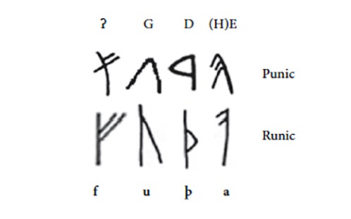 The striking similarity between the Carthaginian and Runic alphabet demonstrated in the first four letters.