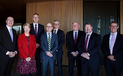 Left to right: Swinburne University of Technology Deputy Vice-Chancellor (Global & Community Engagement) Interim Dr Andrew Smith, Western Sydney University Vice-Chancellor Professor Barney Glover AO, University of Sydney Vice-Principal (External Relations) Tania Rhodes-Taylor, City of Parramatta Lord Mayor Cr Bob Dwyer, City of Parramatta Council CEO Brett Newman, UNSW Sydney Dean of Engineering Professor Stephen Foster, University of New England Sydney Director Robert Field, and Western Sydney Local Health District Acting Executive Director of Medical Services & Director of Education, Research and Education Network Professor Peter Hockey.