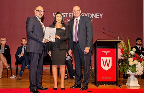 Principal of Brydens Lawyers, Lee Hagipantelis; Western Sydney University graduate and former Brydens Lawyers Scholarship recipient, Janet Dunlop; and Western Sydney University Vice-Chancellor and President, Professor Barney Glover AO.
