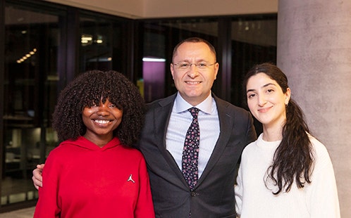 Ambassador of Ukraine to Australia, His Excellency Mr Vasyl Myroshnychenko with journalism students Zuhal Sharifee and Edith Yankuba