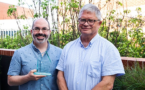 Winner of this year’s Research Impact Competition Dr Jonathan Plett from the Hawkesbury Institute for the Environment receiving his award from competition judge and NSW Chief Scientist and Engineer, Professor Hugh Durrant-Whyte