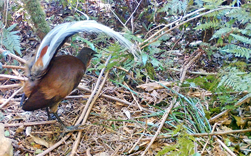 Male Albert’s lyrebirds with their tails displayed. Photo credit: Fiona Backhouse.