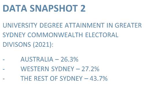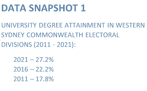 The Census in 2021 captured a moment in time when just 26.3% of Australians were recorded as having a Bachelor degree or higher. By comparison, across western Sydney federal electorates, that figure is now 27.2%, surpassing the national rate for the first time.