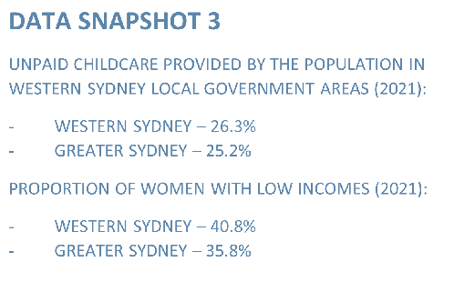 “Despite the remarkable increase in women’s attainment of university qualifications over the last decade, females in western Sydney continue to provide more unpaid childcare and earn less than females in the rest of Sydney.”