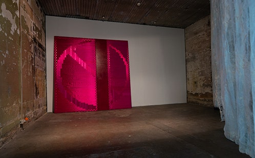 Fiona Davies Blood on Silk: Magenta No Exit, 2017, canvas, paint, wood, and satin ribbon, 285 x 285 (h)cm