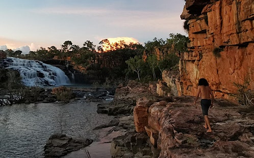 Nyikina Man Nelson follows the River to its source on Ngarinyin Country. Manning Creek, Ngarinyin Country. Lachie Carracher. Supplied by Minority Rights Group.