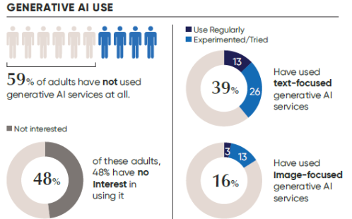 Additionally, four in ten adult Australians have experimented with text-focused generative AI services. However, there is a strong overall negative sentiment towards this technology, with the majority of adults wanting regulation to mitigate potential harms.