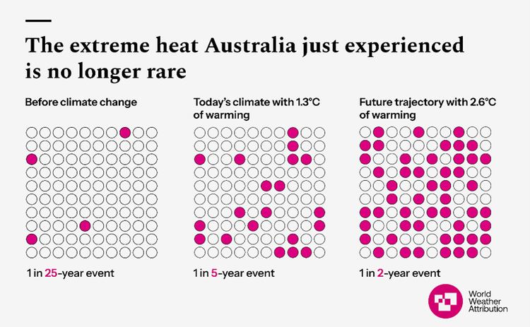 Published by the World Weather Attribution, together with the Red Cross and a global team of leading researchers, the study found that similar three-day heat events that were experienced across Australia in early January, should now be expected once every 5 years, instead of once every 25 years.