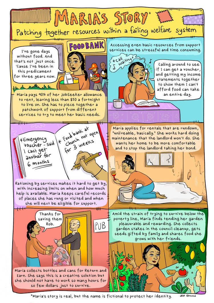 The report documents people stretching resources by sharing or trading provisions like food hampers or relief vouchers, and looking out for ad-hoc opportunities like collecting bottles for ‘Return and Earn’ and participating in market research. While these practices can provide dignity, independence, and sometimes even pleasure, they also expose the holes in Australia’s welfare system and the hidden labour required to get by.