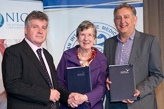 L to R: Announced at the 21st International Australasian Integrative Medicine Association Conference in Melbourne, Professor Scott Holmes, Deputy Vice-Chancellor President, Research and Development from the University of Western, accepts the generous gift of $2 million from Judy Jacka, Vice Chairperson from the Jacka Foundation or Natural Therapies with Professor Alan Bensoussan, Executive Director from the National Institute of Complementary Medicine.