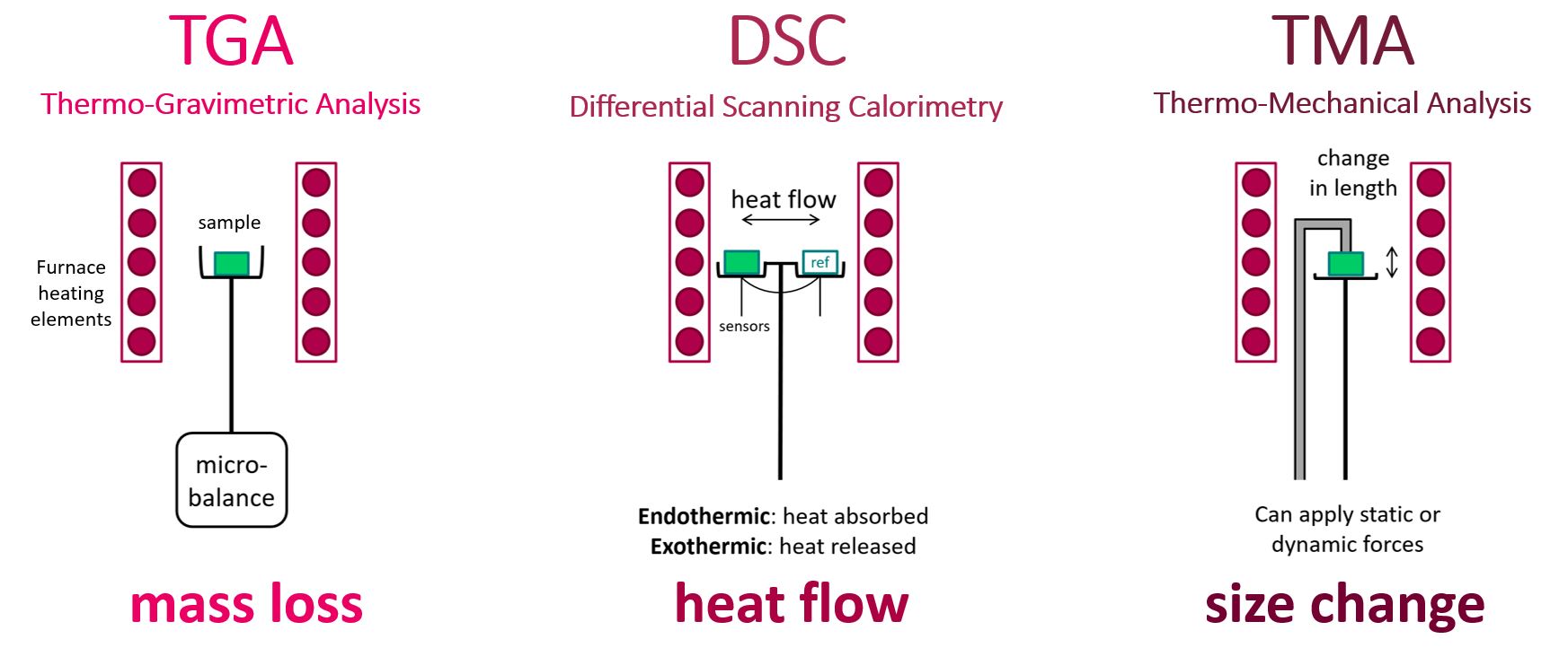 Thermal Mechanical Analysis (TMA): Samples are monitored for changes in physical characteristics as a function of temperature. There are different setups which can allow for analysis of characteristics such as expansion, contraction, pentration, softening points, glass and phase transitions, young’s modulus and elasticity to name a few.