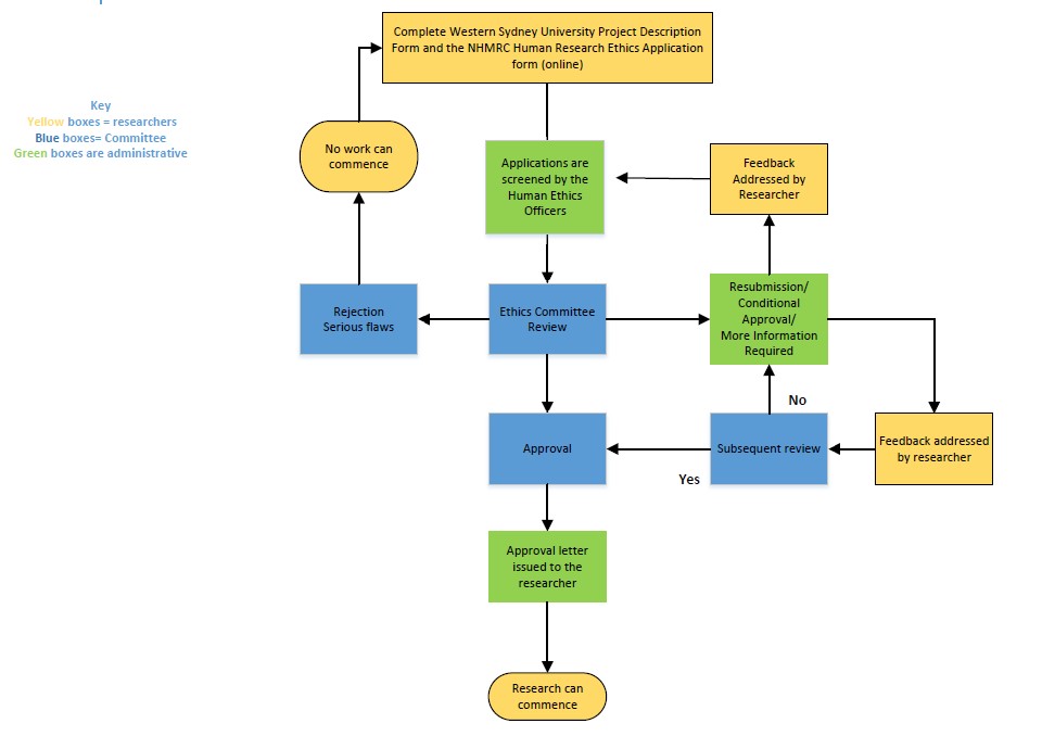 The human ethics review process flowchart (JPG, 63.47 KB) (opens in a new window) summarises the steps involved in applying to the human ethics committee(s).