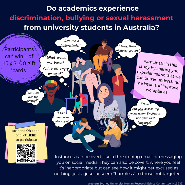 It's really important that we hear from academics across universities about their experiences to understand how widespread the issue is and the impact it has on academics. To participate in the survey click on the image above (which is hyperlinked), scan the QR code or go to: https://surveyswesternsydney.au1.qualtrics.com/jfe/form/SV_9M59XZSFDF6oWvY