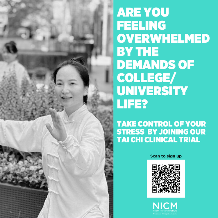 Researchers from Western's NICM Health Research Institute have co-designed a Tai Chi-based Stress Reduction program for higher education students with health professionals, Tai Chi instructors, and students. A pilot randomised controlled trial will be held to explore the feasibility, effects, and cost-effectiveness of the stress reduction program in reducing stress, anxiety, and depression among students. Tai Chi is a mind-body exercise that combines martial arts movements, meditation, deep breathing, meridian theories, and yin and yang theories to promote relaxation, harmony, inner peace, and improve overall health and wellbeing.